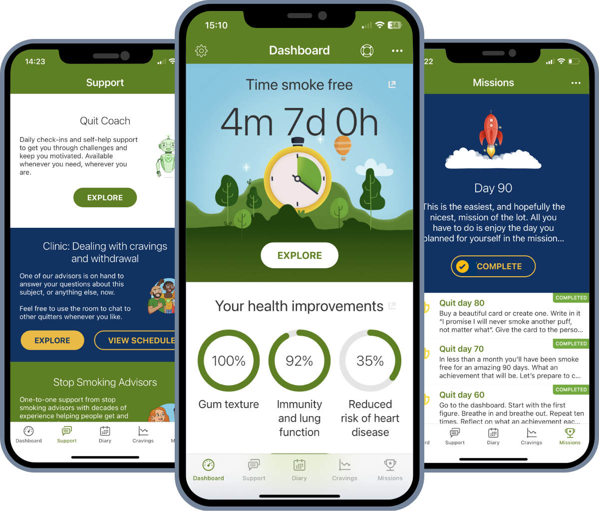 Smoke Free includes missions that double your chances of getting to the critical three-month milestone, a chatbot which increases success rates even further and plenty of badges and tools to show you how well you’re doing and how far you’ve come.